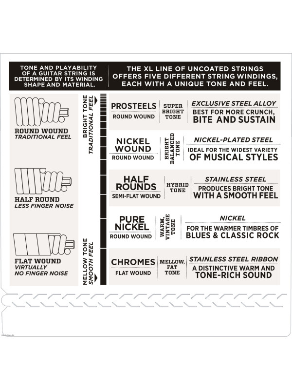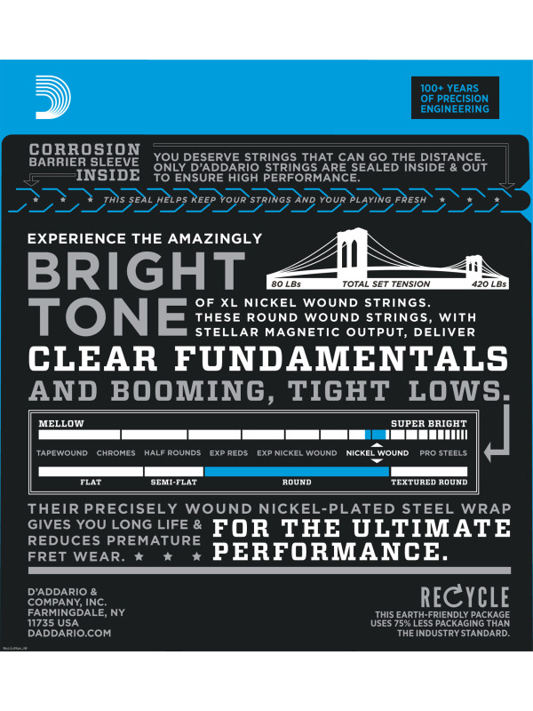 D'Addario XL Nickel Wound žice za bas gitaru su svjetski poznate među basistima svih žanrova i stilova. Sve XL žice precizno su namotane niklom obloženim čelikom na ekskluzivnim digitalno upravljanim strojevima, što rezultira dugotrajnim, izrazito svijetlim tonom, besprijekornom intonacijom i izvrsnim magnetskim svojstvima, te ih čini prikladnim za najrazličitije bas gitare i glazbene stilove.