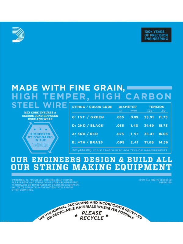 D'ADDARIO EXL180 je najtanji set žica za bas gitaru iz D'Addario EXL serije, pruža veću fleksibilnost, održavajući pritom ton čvrstim i konkretnim, uz ugodan osjećaj sviranja. Prikladan je za sve stilove sviranja i odgovara svim standardnim "long scale" bas gitarama, duljine skale do 36 1/4 inča.