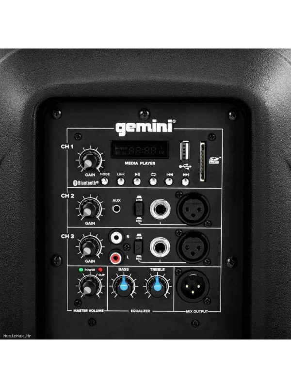 S tolikom snagom u kompaktnom dizajnu, savršen je za bilo koju priliku, i Gemini s ponosom ističe kao izvrstan omjer cijene i kvalitete. Ugrađeni medijski player omogućuje reprodukciju MP3/WAV datoteka s USB-a i SD kartice, kao i FM radio prijem.
