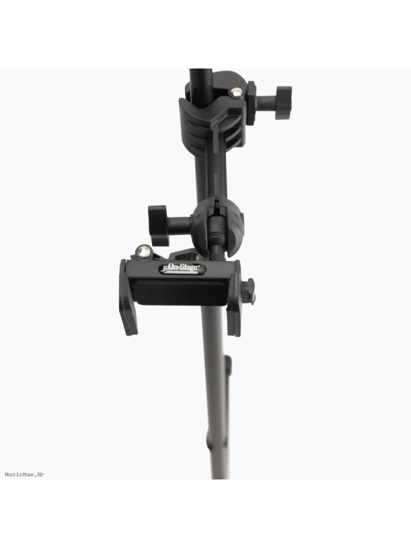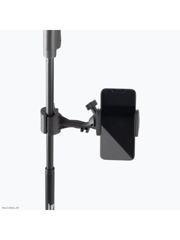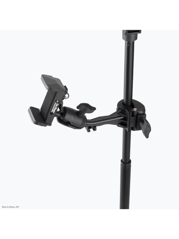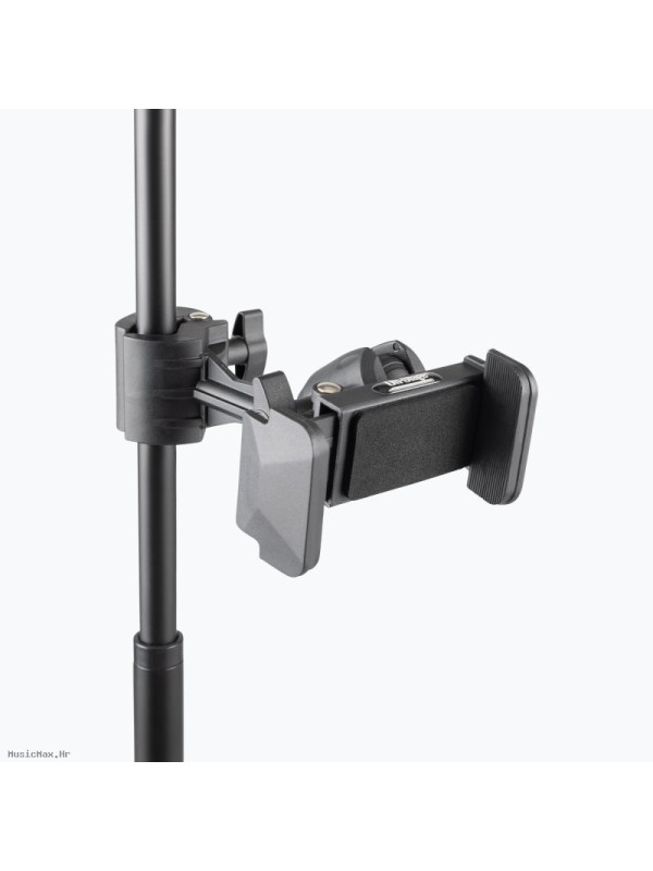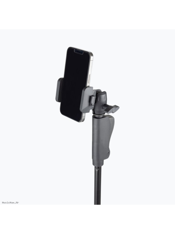 The TCM500 Smartphone Holder for Mic Stands securely attaches to a mic stand and holds a smartphone for ease of reading music or lyrics, live streaming, or creating audio/visual content. This space-saving holder makes it possible to mount a phone in a convenient location for practice, performance, streaming, or recording without setting up an extra stand. The ball joint on the phone clamp provides the option to mount the phone for use in portrait or landscape modes. It also enables rotation and tilting of the phone to further dial in just the right angle for comfortable viewing or for streaming or recording video. The phone clamp adjusts in size to ensure a snug fit for a wide range of phones up to 4 inches in width. Padding on the clamp protects phones from scratches and dents while providing traction for a secure, stable grip to keep phones safely in place. With its black finish, this versatile accessory adds to a professional presentation in any venue, recording studio, or streaming setup.