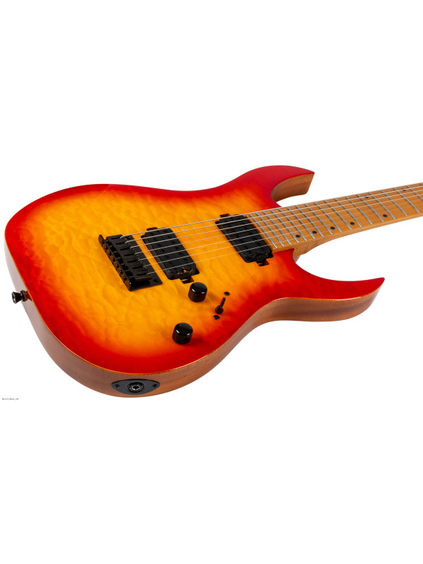 The S-507 is Spira’s flagship 7 string model, lovingly crafted for players who expect the highest level of performance and aesthetics. The S-507 features a luxurious mahogany body with a stunning quilted maple top, delivering both exceptional resonance and eye-catching beauty. The roasted maple neck and fretboard offer unmatched stability and a smooth, responsive playing experience, ideal for advanced techniques.